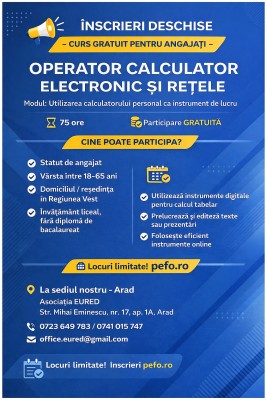 Înscrieri deschise la cursul modular GRATUIT de OPERATOR CALCULATOR ELECTRONIC ȘI REȚELE la Arad!