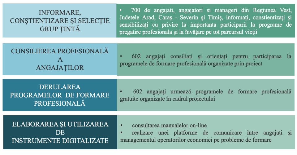 - creșterea nivelului de conștientizare privind importanța formării profesionale continue în rândul angajatorilor și a minim 700 angajați din Regiunea Vest, județele Arad, Caraș-Severin și Timiș, pe o perioadă de 24 de luni;