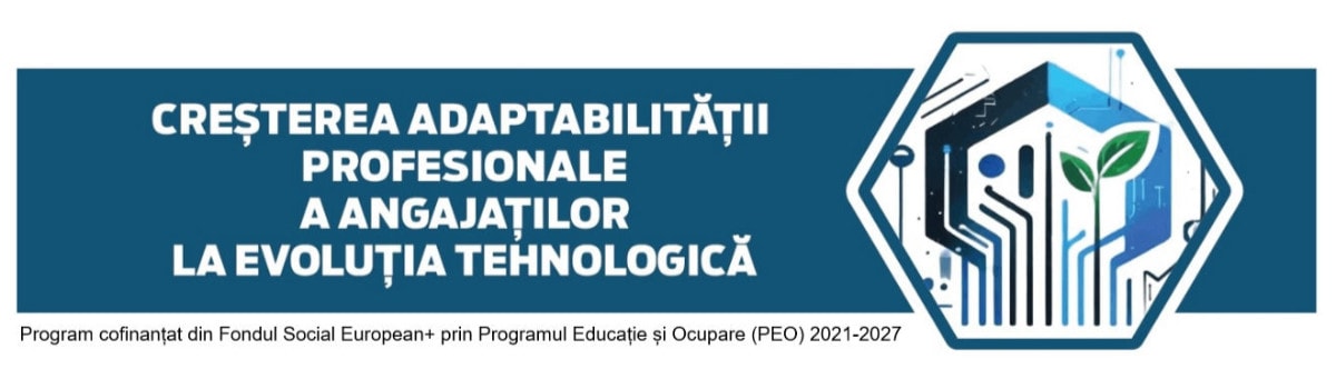 Proiectul "Creșterea adaptabilității profesionale a angajaților la evoluția tehnologică" este cofinanțat din Fondul Social European+ prin Programul Educație și Ocupare (PEO) 2021-2027 (PEO/78/PEO_P9/OP4/ESO4.7/PEO_A36 - cod proiect 301765).