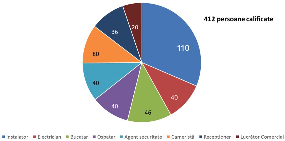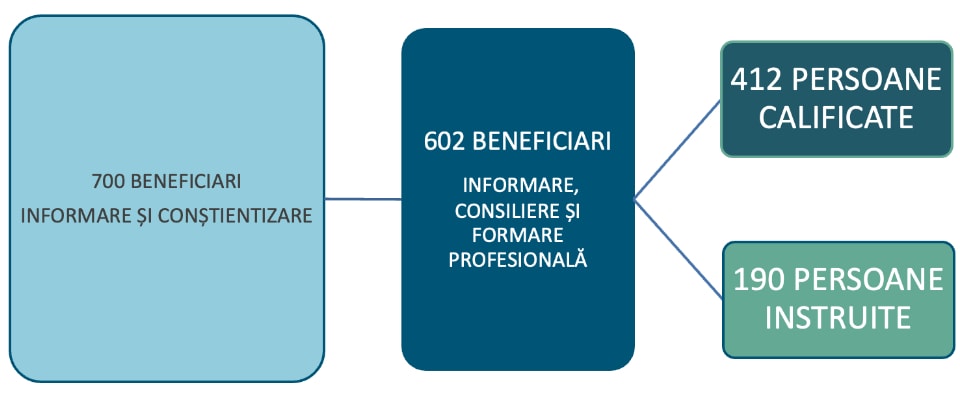 - Dezvoltarea competențelor profesionale și a abilităților personale pentru un număr de 602 de angajați și manageri din Regiunea Vest, angrenați în dinamica economică și evoluția tehnologică, pe o perioadă de 24 de luni.